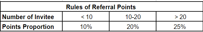 Inviter: Every inviter will get a 10%-25% percentage of invitee. If the inviter gets 15 invitees who generate 15000 points in total, then the inviter will get 15000*20%=3000 points.